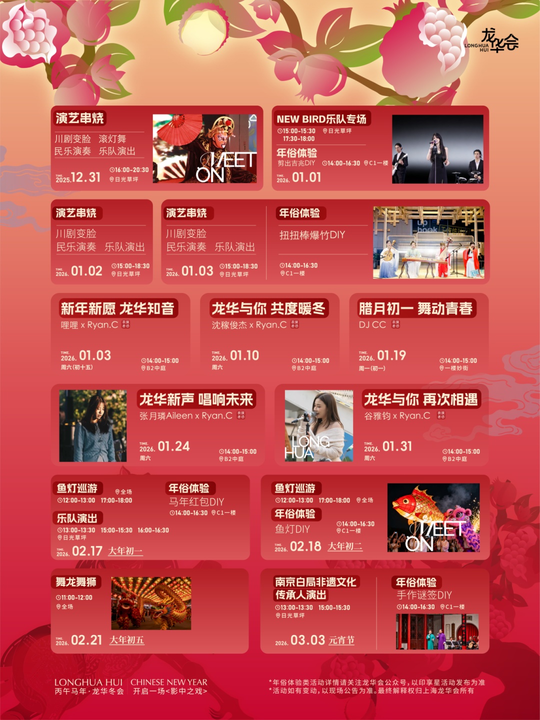 此外,上海本帮菜淘小馆、FUFUSOUL香氛IP店、宠物世家、Tamkoko泰柯茶园、哆来玩吧等新店也将于2月集中亮相,持续刷新街区生态。龙华会还联合优衣库、奥乐齐、小米等品牌推出岁末礼遇,消费满减、购物返现、购机赠礼等限时福利,让艺术节庆与实惠消费深度融合。