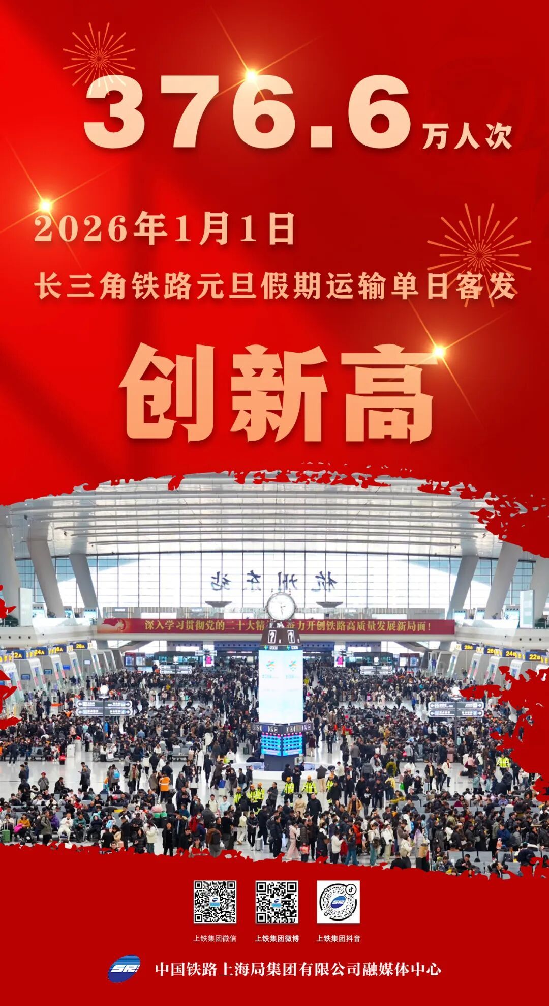 1月2日,2026年元旦假期第二日。当天,长三角铁路客流持续高位运行,当天预计发送旅客265万人次。在刚刚过去的一天(1月1日),长三角铁路发送旅客376.6万人次,同比增长约59.1%,创元旦假期运输单日客发新高。