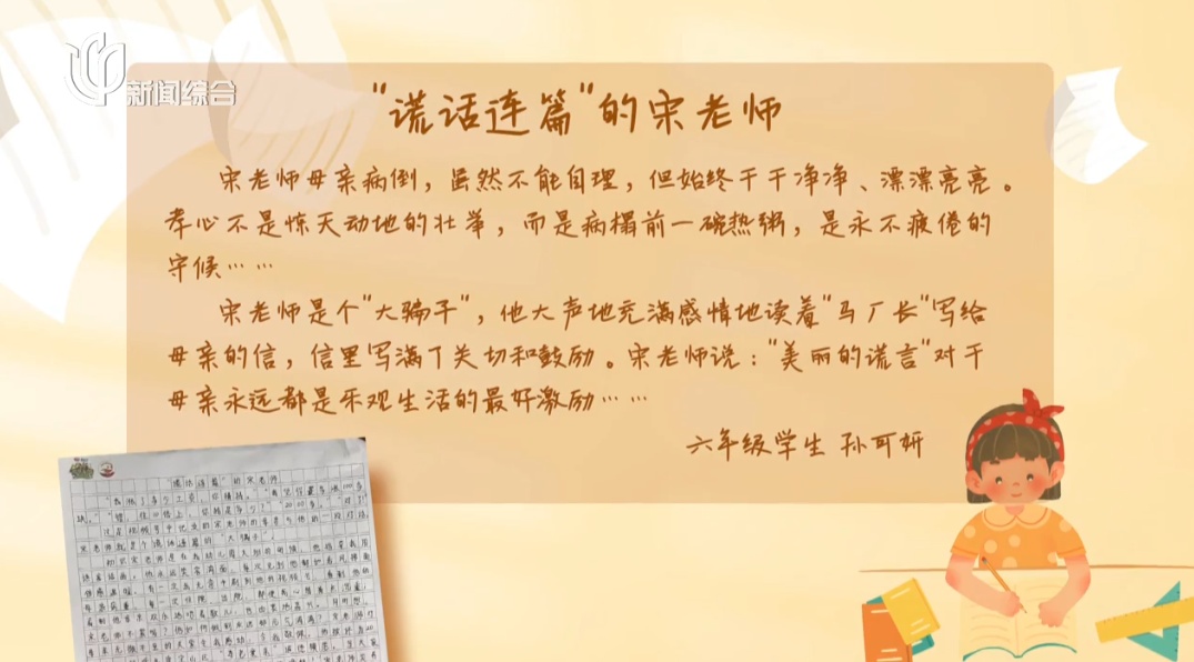 2018年,宋护彬的母亲因脑梗而病倒,瘫痪卧床,父亲年迈,他便在单位附近租了个小房,方便见缝插针照料母亲。孩子在作文里写的,正是宋护彬为了鼓励母亲积极康复,请朋友假扮母亲厂里的领导,来给母亲送锦旗的一幕。