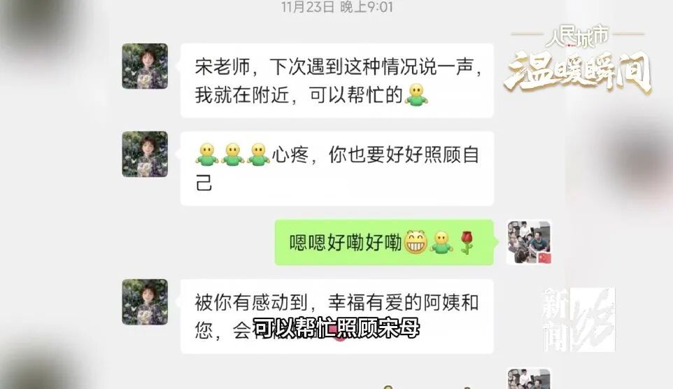 好几位班上的家长知道了,主动提出在宋老师分身乏术时,可以帮忙照顾宋母。还有好几个孩子常来看望,宋护彬母亲十分感动:“都来了,也不嫌我脏。握我的手说,老奶奶你好,奶奶”。