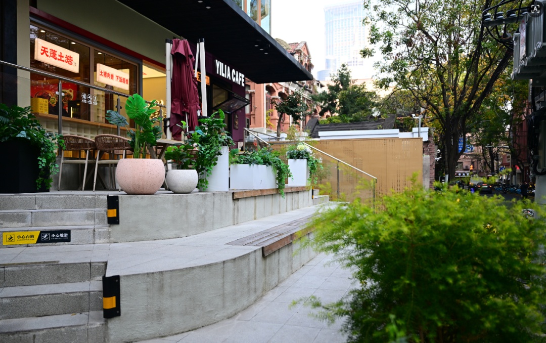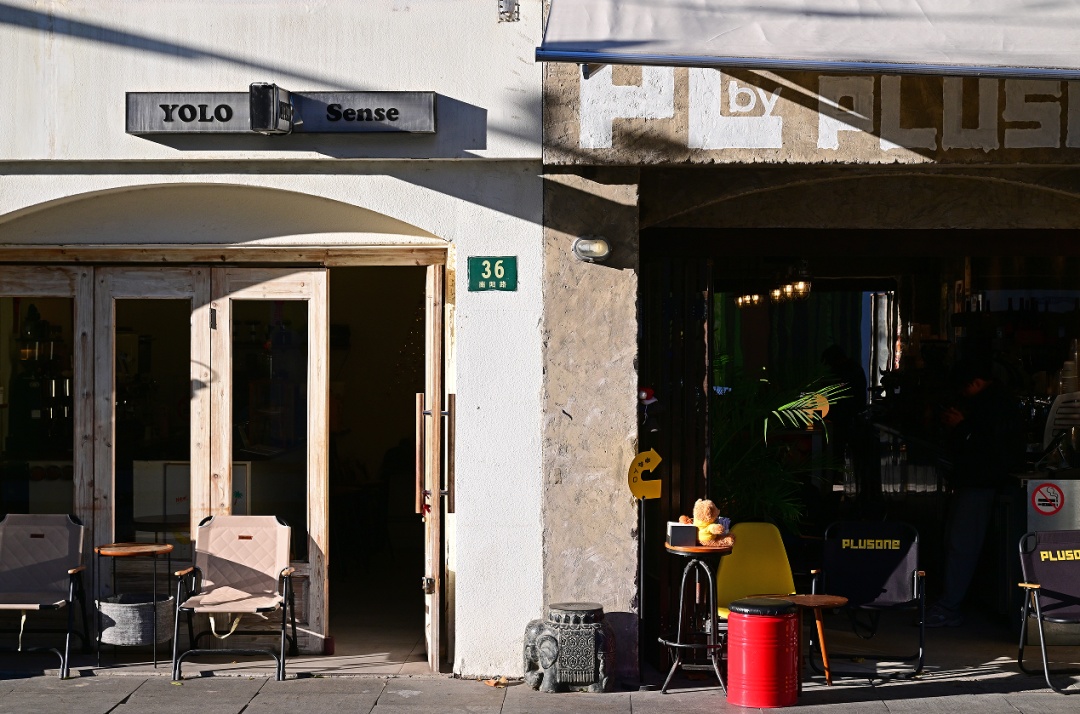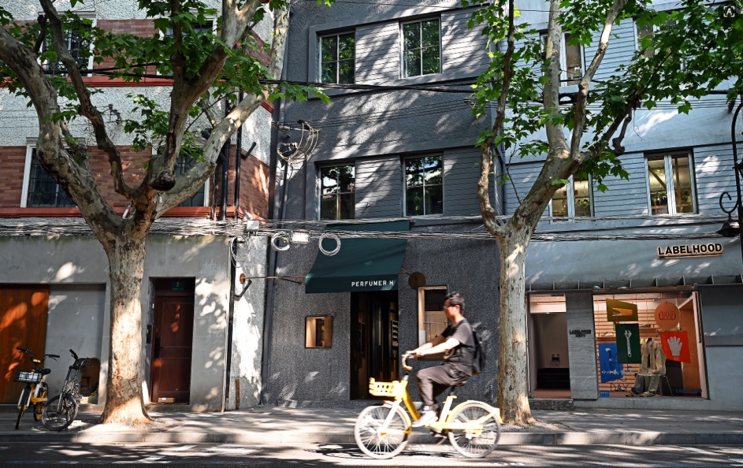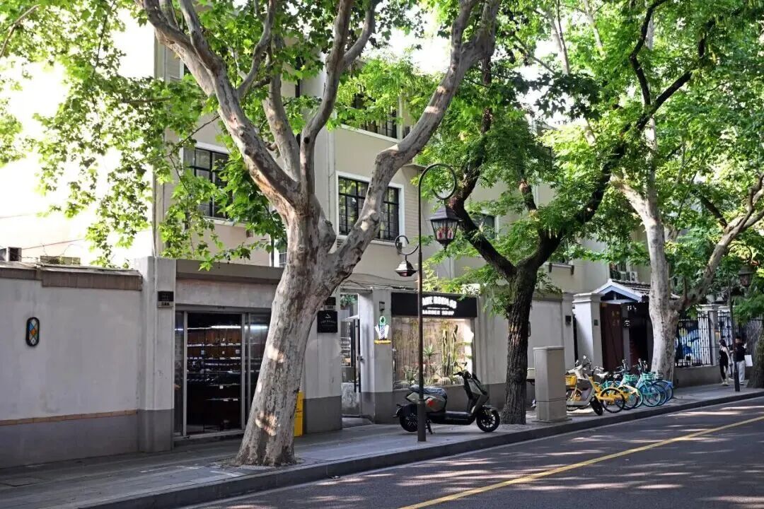 沿着南阳路悠然漫步,一路走到与之相接的奉贤路,葱茏乔木掩映下的老洋房与网红小店相映成趣,密密麻麻点缀了风格不一的餐饮店,中外混搭。