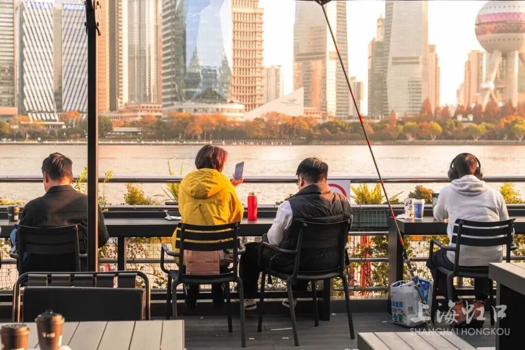 没有门窗的阻隔,顾客取杯咖啡便可随意落座,直接将浦江波澜与都市天际线尽收眼底。陆家嘴的摩天楼群、外滩的历史建筑、往来穿梭的船舶,共同构成一幅动态的全景画。尤其在冬日的暖阳下,倚坐户外,手捧一杯热饮,江风轻拂,别有一番开阔与惬意。