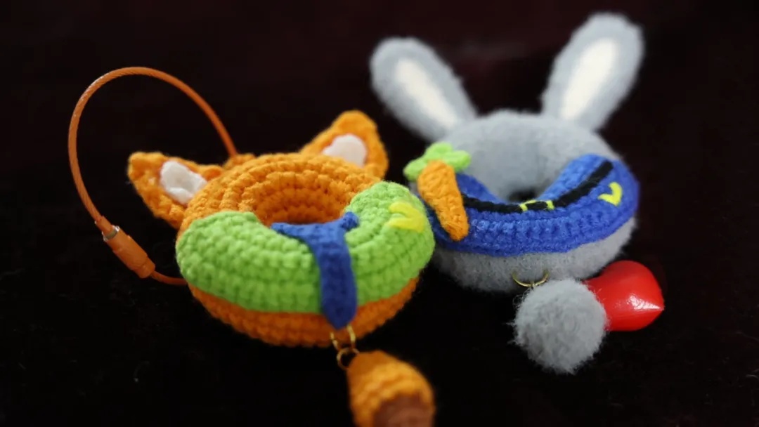 “钩的时候,心里得想着它们的性格特点。”汪懿手指翻飞,钩针与棉线轻盈舞蹈。只见浅灰色毛线逐渐立成朱迪精神的耳朵,配上迷你胡萝卜和一颗小红心,俏皮又温柔;橙色线则化身尼克狡黠的狐狸耳,加上标志性的绿色上衣和小尾巴吊坠,帅气瞬间拉满。两个小挂件凑在一起,电影里那份有趣的友谊仿佛就在指尖重现。