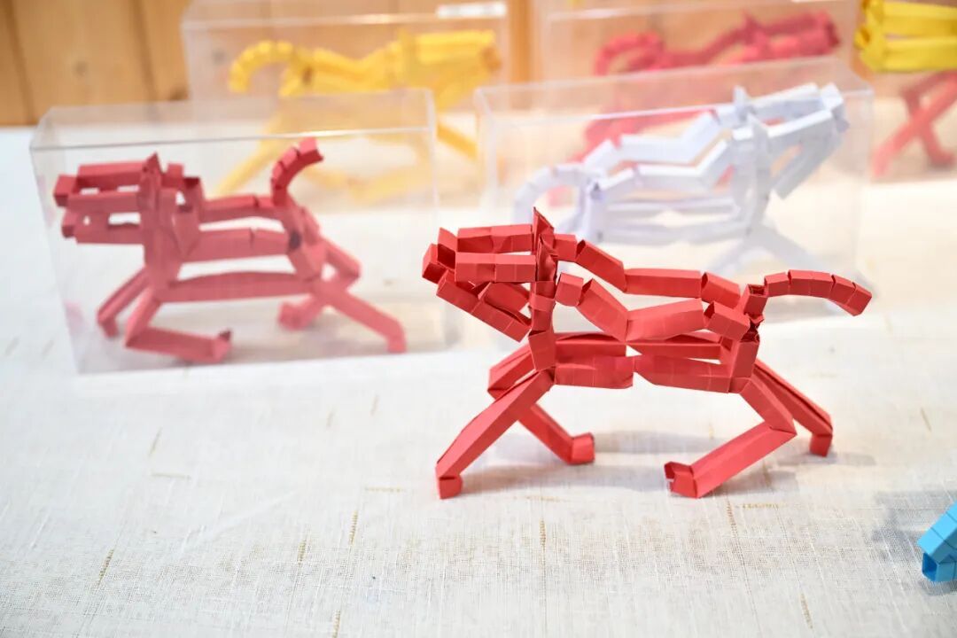 创意纸结构的创始人杜永念透露,这一技艺的灵感源于中国传统建筑榫卯结构。展览中,他现场演示了纸马的拼接过程:将马腿的榫头插入马体的卯眼中,一匹立体纸马便跃然眼前。