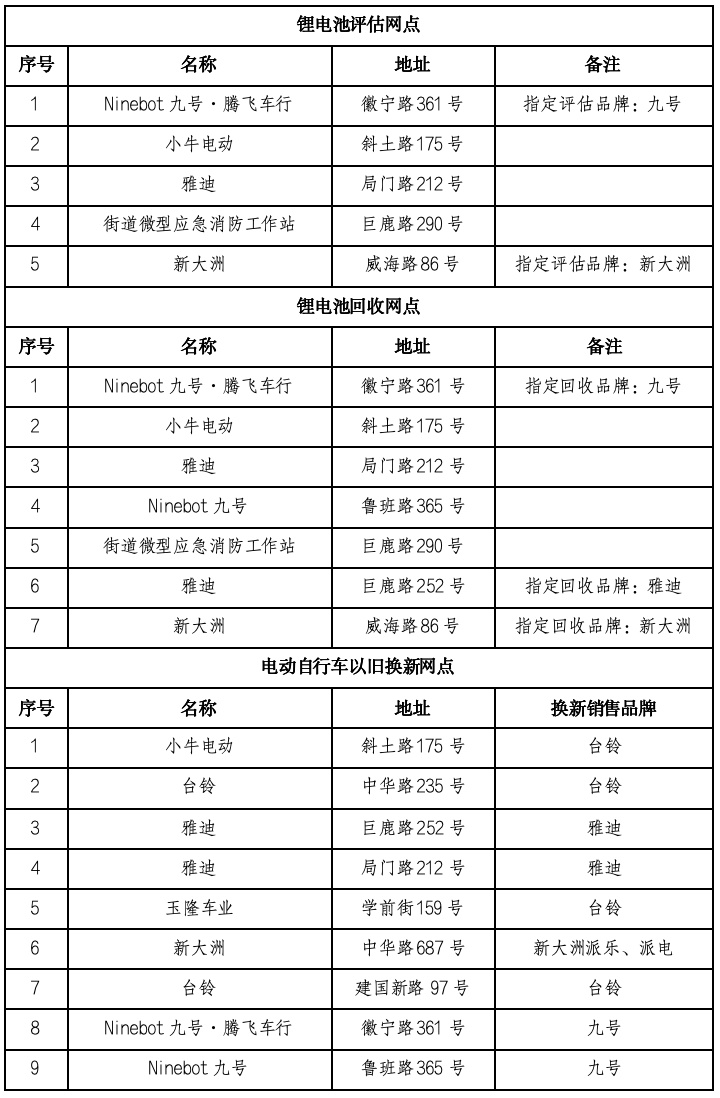 各网点的工作时间以门店的实际经营时间为准。请电动自行车主高度重视电池安全,根据实际情况,及时前往网点进行锂离子电池评估及回收,用好以旧换新补贴等政策及时更新老旧电动自行车。后续网点信息也将根据实际情况进行调整和更新。