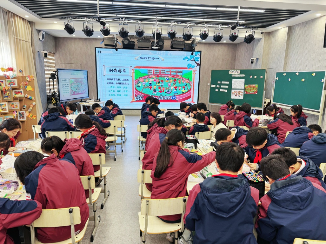六年级学生先借助AI工具构思灯架造型,系统掌握扎制、裱糊等传统灯彩工艺;再深入探究农民画的核心特征,将校徽、校园标志性建筑等元素与元宵灯会场景相融合,创作主题画作;最终通过热烫印工艺,将作品转化为帆布袋文创产品,实现“工艺制作—艺术创作—实用转化”的全流程实践,完美契合素养导向下课堂关键要素的实践要求。