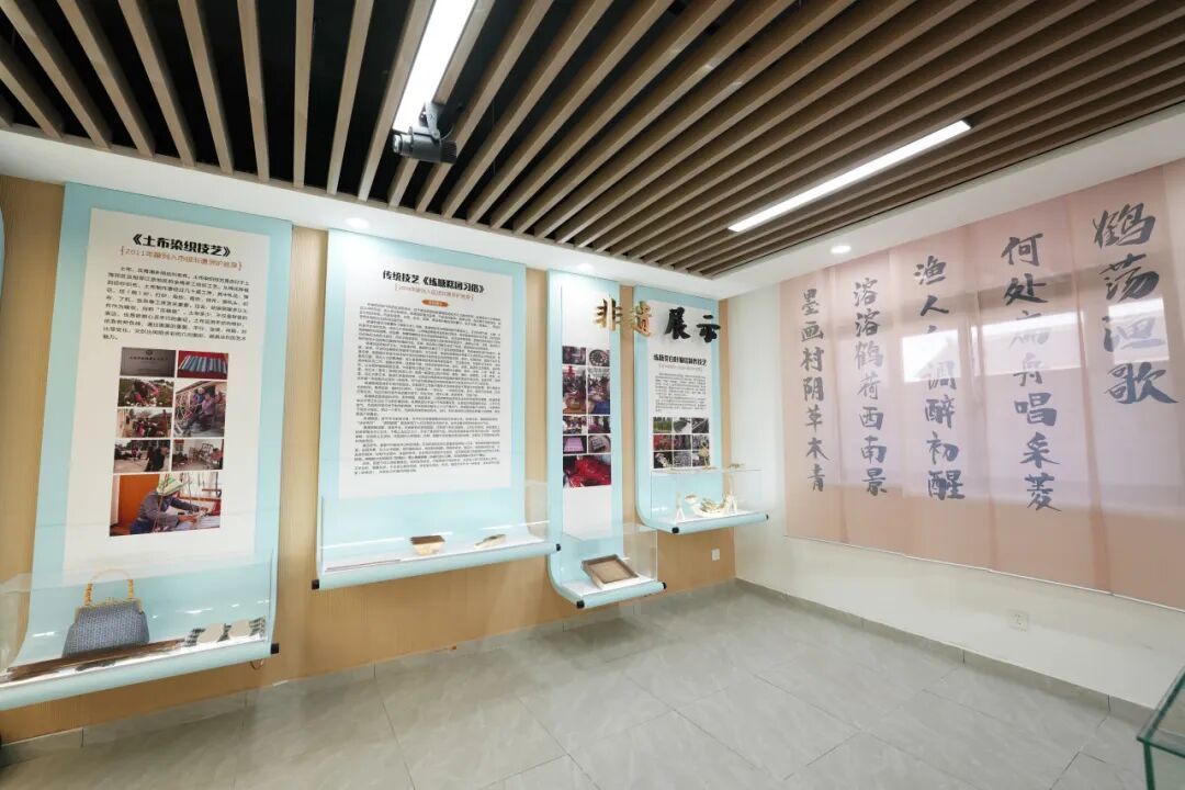 非遗展示栏是场馆的核心亮点,集中陈列联农村及周边区域的非物质文化遗产成果,包括茭白叶编结、练塘糕团习俗、土布染织技艺等,每件展品均配有详细的文字说明与工艺解读,让游客和村民近距离感受传统技艺的魅力。