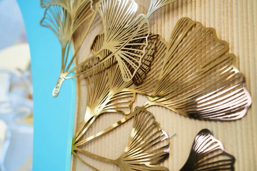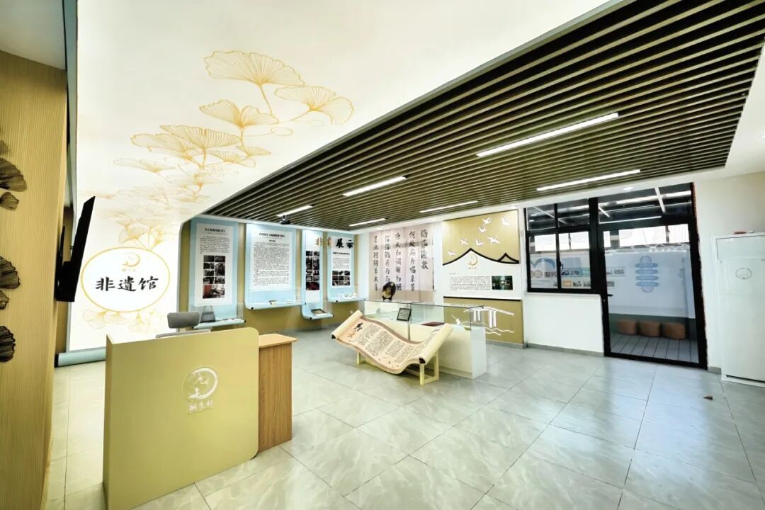 联农村深挖历史积淀,以古桥、古寺、古树等文化遗存为依托,打造特色非遗馆,让历史文脉在当代焕发新生,成为村庄文化品质提升的核心阵地。非遗馆的打造紧扣村庄特色,以村内标志性的七百多年银杏古树为灵感,内部广泛采用金色银杏叶元素进行装饰点缀,从墙面浮雕、展柜边框到吊顶造型,处处融入银杏元素,既呼应了村庄的自然生态禀赋,又营造出温润雅致、古意盎然的空间氛围,让游客与村民一踏入场馆便能感受到浓厚的本土气息。