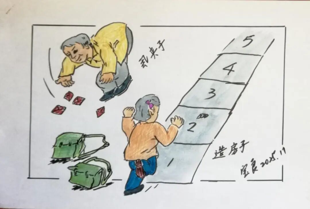 “造房子”一般是小姑娘玩得多,丢一小串物在一格子里单腿跳过去,再回来再丢下一个格子地跳,直至终点。