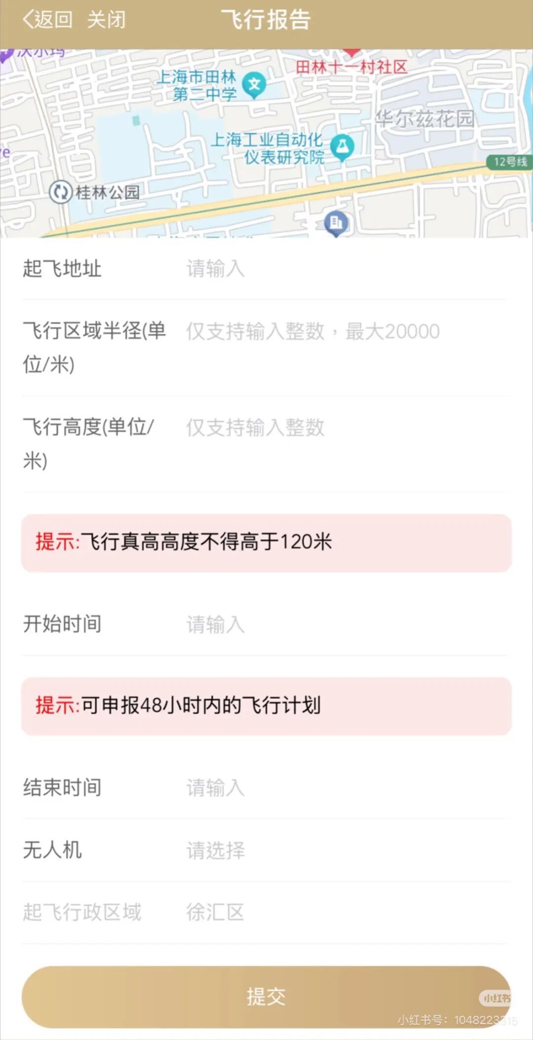 每次起飞前,需点击“个人飞行报告”按钮进入报备页面,在输入起飞地址、飞行区域半径及高度等相关信息后,地图上会自动标注相应区域,请仔细核对信息无误后,点击提交按钮即可完成无人机飞行报备。