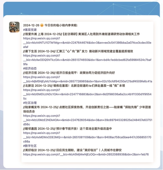 “临小助”带来的便捷,早已融入了社区干部的日常。如今每天清晨,不少社工打开微信的第一件事,就是看“临小助”推送的《每日内参》。这份贴心的内参会自动抓取三百多个权威微信公众号的动态,并根据“基层党建”“社区治理”等主题分门别类整理。再搭配上“加油站”的每日一题,利用晨会前、午休时的碎片时间,就能轻松学政策、涨知识。日积月累,这些内容成了各居民区晨会讨论时离不开的“热门素材”和“灵感来源”。
