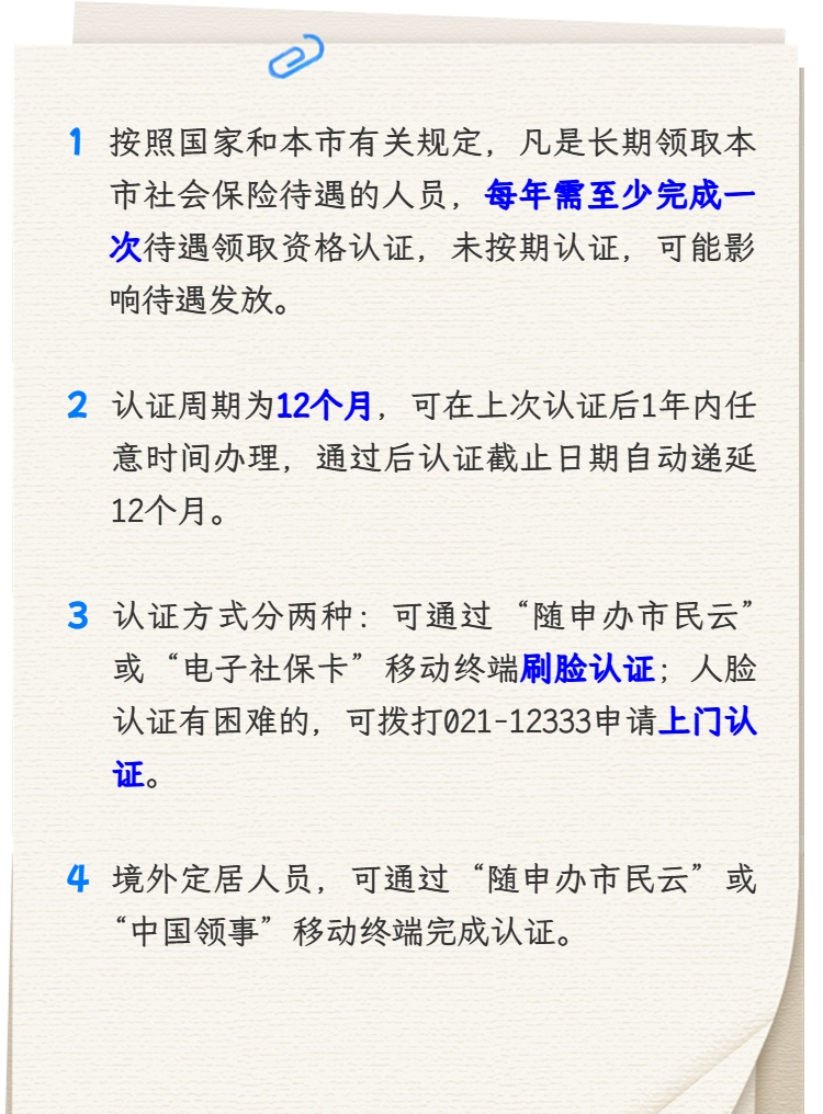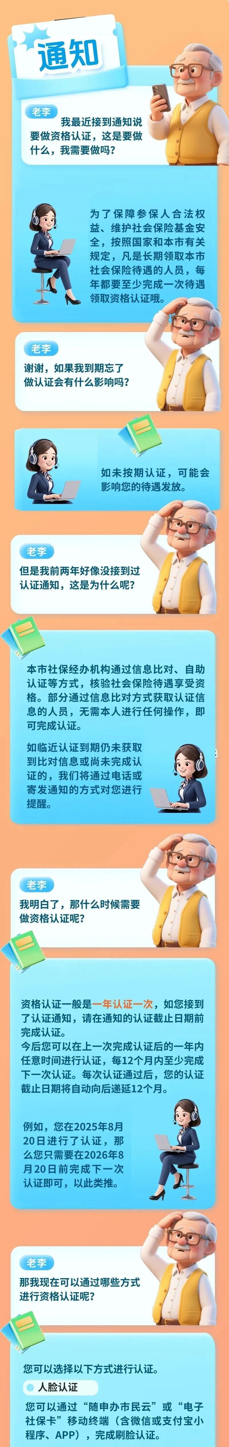 市人社局介绍,为了保障参保人合法权益、维护社会保险基金安全,按照国家和本市有关规定,凡是长期领取本市社会保险待遇的人员,每年至少完成一次待遇领取资格认证。