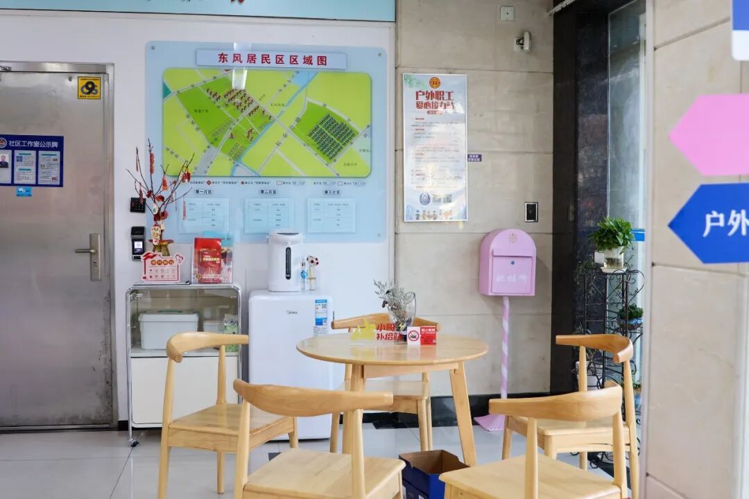 东风居委会爱心驿站地处人流密集的街区中心,设在服务大厅内的这处温馨角落,提供饮水、手机充电、微波炉加热、临时休息等服务,并配备医药箱、雨伞等生活用品。“累了能歇脚、闲时能充电、渴了能喝水、饭凉能加热、烦时能解压……”门口的暖黄色标语醒目,室内放置了指示卡牌,一方桌子、四张椅子为户外职工撑开一片防风抗寒的小天地。