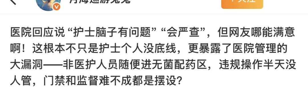 ◼也有网友质疑医院管理存在漏洞,非专业人员可随意进出配药室等核心区域,暴露出门禁、巡查及监督形同虚设。
