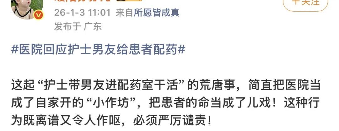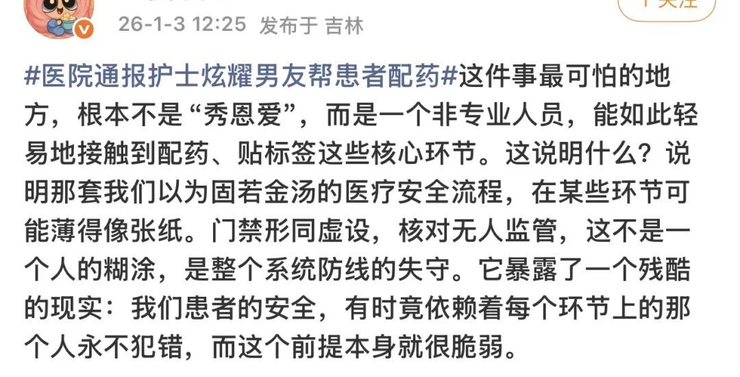涉事护士这一行为不仅突破职业伦理,更触碰了医疗安全的红线。医疗工作的专业性容不得半分戏谑,配药、核对标签等操作关乎患者生命安危,需严格遵守“三查七对”制度,绝非可随意托付的“私事”。涉事护士将违规行为当作“秀恩爱”的素材,本质是对职业责任的漠视,对患者权益的无视。