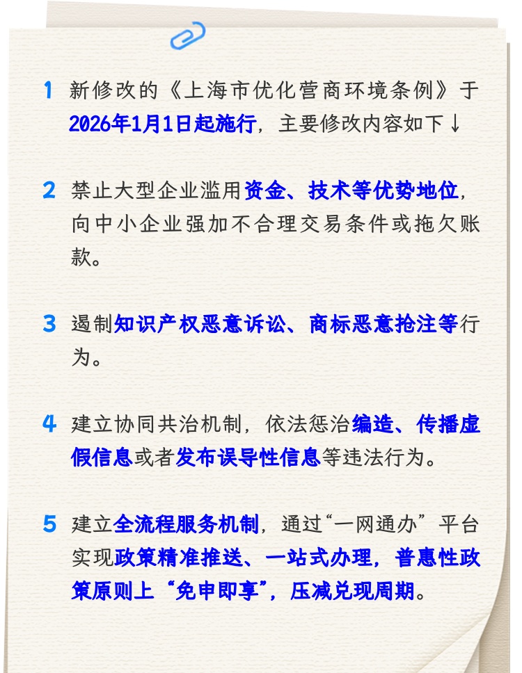 市十六届人大常委会第二十五次会议表决通过了关于修改《上海市优化营商环境条例》的决定,新修改的条例于2026年1月1日起施行。一起来看市发展改革委的介绍↓点击“划重点”极速浏览↓↓↓ 资料:市发展改革委、上海发布编辑:姜天澍点击下方了解更多 普陀 你好 | 特检守毫厘,匠心护久安 一帧一景,普陀这场展览邀您共赏不一样的真如之美! 【健康】普陀区中心医院新技术为膝痛患者带来希望→ 新年迎新居,普陀“好房子”开启“暖居”新生活 新年启新程!TOP中央公园迎新游园会热闹开启