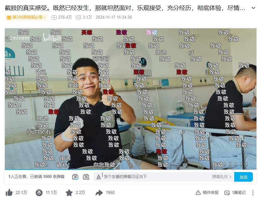 意外截肢却依旧乐观生活的UP主@小何教官-铁手版 收到了B站用户2025年发出的第一条“致敬”弹幕。满怀热爱与勇气追逐台风、雷暴、龙卷风的UP主@风羽酱-sdk ,克服畏惧与成见传承“打铁花”技艺的女孩UP主@江寻千 等诸多平凡人的逐梦之旅也得到了大家的“致敬”。可见,年轻人既崇尚家国叙事、英雄主义,也会被富有烟火气的“场景”触动。宏大与平凡共生,新大众文艺催生繁花绽放,也解释了为何“致敬”能形成如此广泛的情感共鸣。这种对“平凡中的伟大”的发掘,让新大众文艺创作回归生活本身,也让“致敬”成为每个人对美好生活态度的自我投射。