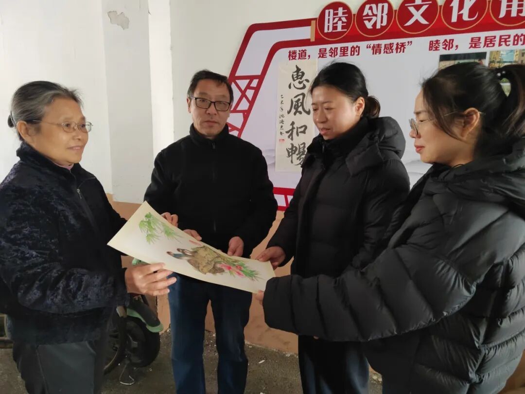 “这幅《惠风和畅》,是社区一位青年书法老师特意为楼道创作的,寓意邻里关系如春风般和煦。”图们路睦邻中心社工指着墙上的书法作品介绍。另一侧,退休居民郭阿姨捐出的花鸟画,也为楼道增添了几分盎然生机。
