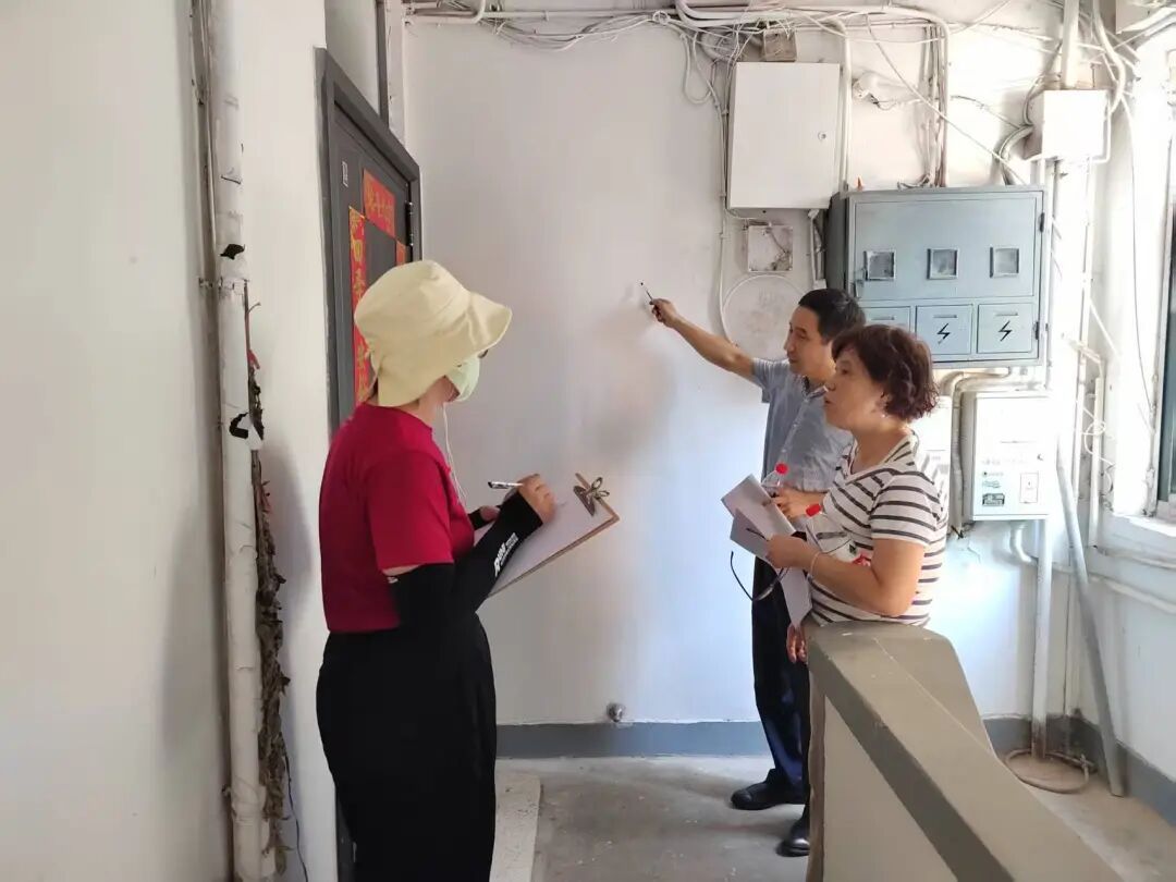 半年前,这里还是另一番景象。作为典型的老旧公房,50号楼面临着电线杂乱、墙面斑驳、公共空间狭窄等“老大难”问题。初夏时节,图们路睦邻中心的社工深入社区调研,居民们诉求不一:有的希望规整如“蜘蛛网”般的电线,有的抱怨新老水表箱不匹配、阻碍通行,还有人提议美化脏污的墙面。