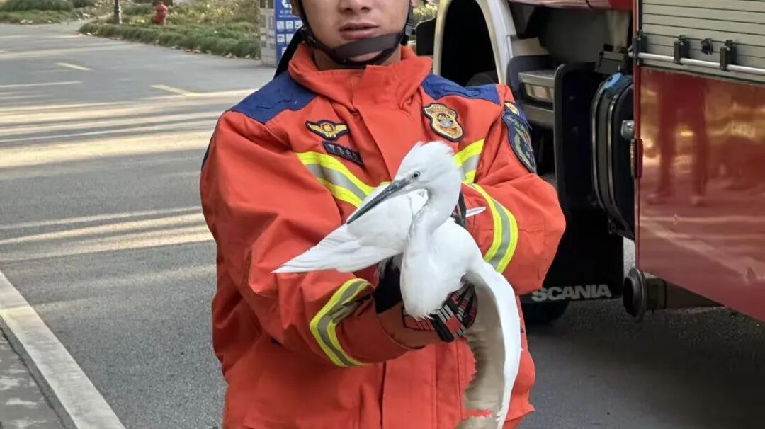 一名经验丰富的消防员携带剪刀与保护手套,稳步攀上救援梯,小心靠近白鹭。他一边轻抚,一边将这只受惊的鸟儿拢入怀中。在其他消防员的配合下,他瞅准时机剪断了几处缠绕的绳子,全程不到10分钟。