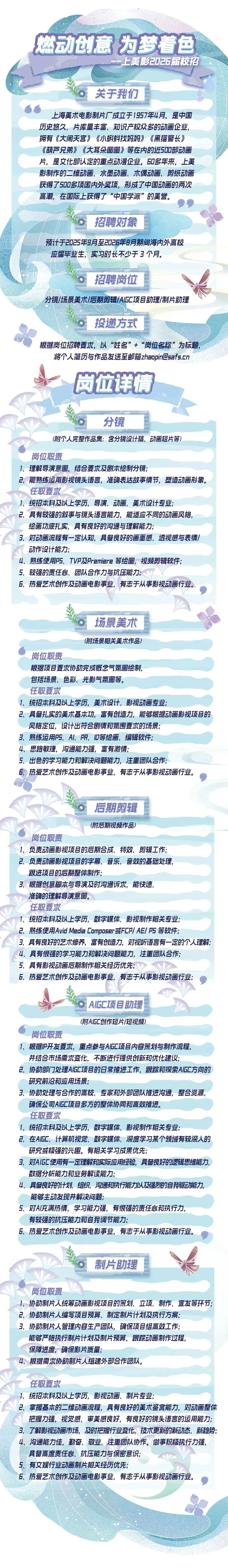 上海美术电影制片厂2026届校招分镜/场景美术/后期剪辑/AIGC项目助理/制片助理