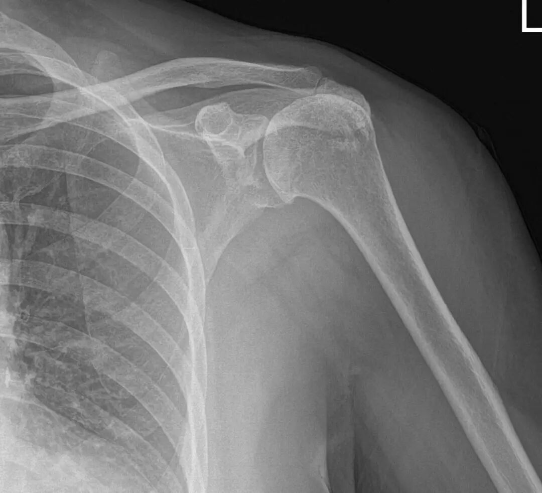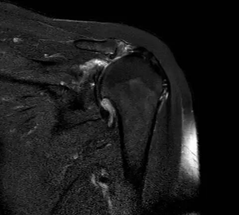 ▲患者肩关节平片及MR提示巨大肩袖撕裂、肱骨头半脱位、骨关节炎