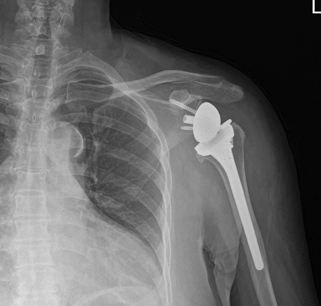 程飚向施阿姨详细讲解了她的病情,普通的肩关节镜微创手术已无法达到理想的效果,需要为其更换一套全新的“肩关节动力系统”,即:反式人工肩关节置换术。完善术前相关准备后,在手术室护士和麻醉科医师的协助下,程飚为施阿姨成功施行了反肩关节置换手术。术后X片显示假体位置良好,当前施阿姨在康复科医师的指导下开始了康复锻炼。