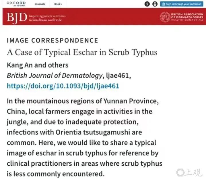 这项临床研究还实现了该院SCI论文“零的突破”。2023年末,题为《A Case of Typical Eschar in Scrub Typhus》的影像通讯稿,正式发表于皮肤病学领域知名期刊《英国皮肤病学杂志》。这不仅为非流行地区的医护与公众认识恙虫病提供了重要参考,也标志着当地科研能力迈出了关键一步。