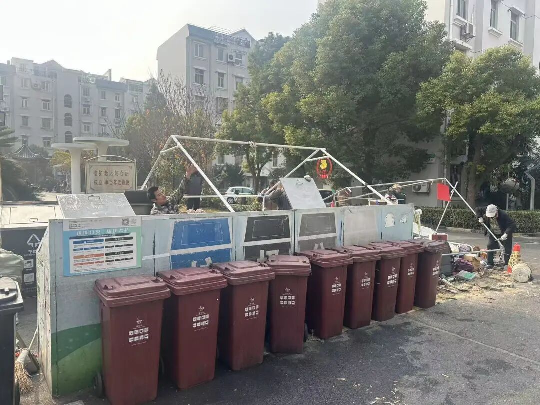 静安区彭浦镇白遗桥居民区永灵小区北门,一处本应为落实垃圾分类要求而建设垃圾箱房的点位,因条件所限,推进困难重重。多年来,两个破旧的油布帐篷成了临时替代,也逐渐成为影响环境与居民心情的“堵点”。“每次路过都觉得碍眼”“夏天味道特别重,窗户都不敢开”……面对居民强烈的改善呼声,居民区党总支引领“三驾马车”协力攻坚,最终,帐篷被拆除,桶具找到了规范的“家”,老旧垃圾点实现“逆袭”,小区门口重归整洁清爽。