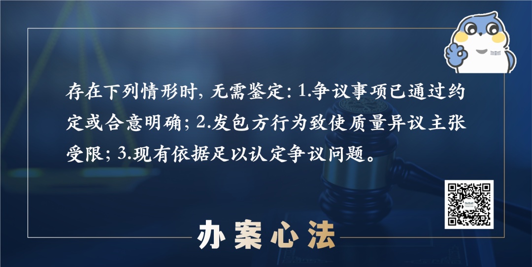 根据《最高人民法院关于人民法院民事诉讼中委托鉴定审查工作若干问题的规定》(以下简称《委托鉴定审查规定》)第1条,人民法院在审理案件过程中,应严格审查拟鉴定事项是否属于查明案件事实的专门性问题,并明确列举了不应进行鉴定的情形。具体到建设工程案件,并结合《建设工程司法解释(一)》第二十八条、第三十条规定,存在下列情形时,无需鉴定: