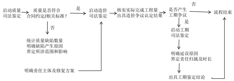 2. 工程质量鉴定:一般分为三个阶段,首先鉴定工程是否符合合同、法定标准,若工程不合格,确定各方就工程不合格所应承担的责任比例;其次,当工程存在质量缺陷时,由双方或工程质量鉴定机构确定修复方案;最后,由鉴定机构对修复和整改方案所产生的费用进行鉴定。