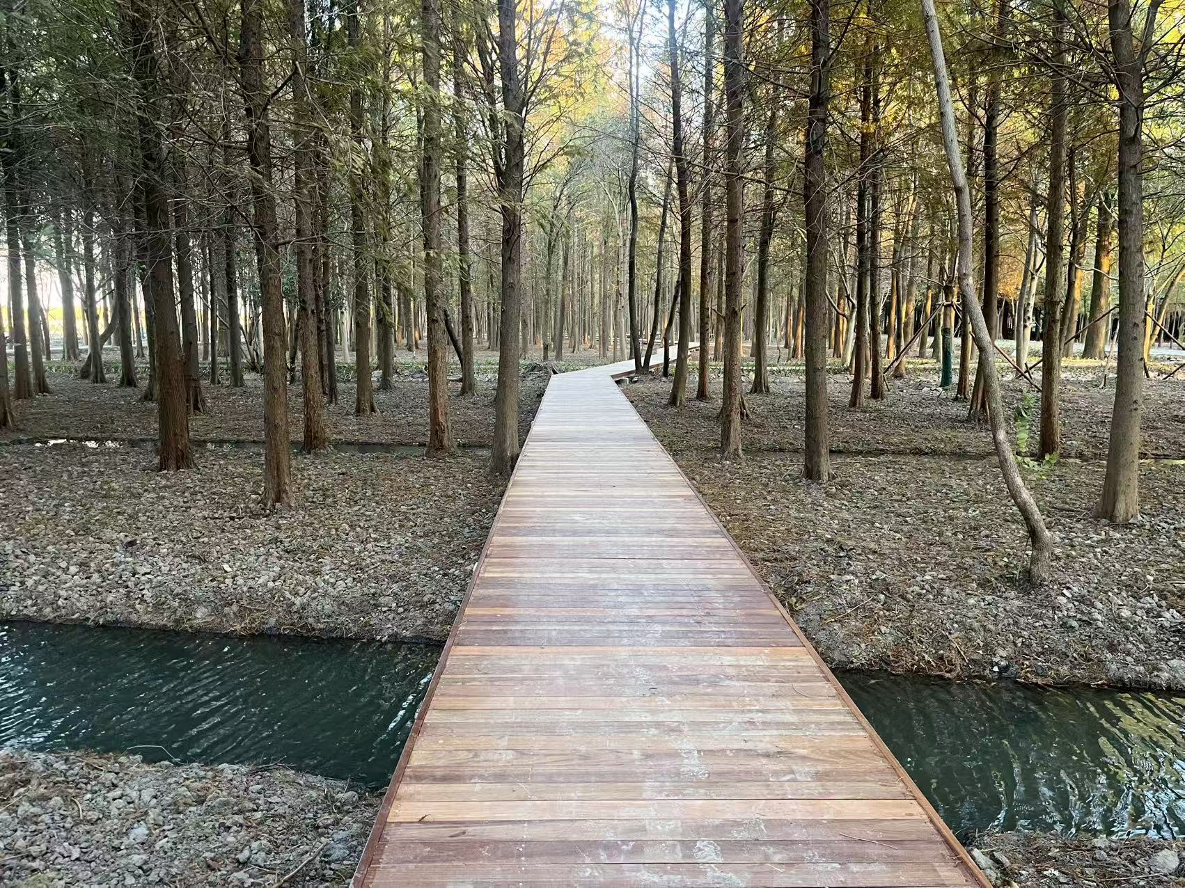 湿地总面积约119亩,坐落于上海黄浦江上游水源保护区内,东邻林地、西接乡界泾、南至新九路、北近黄浦江,坐拥天然洼地湿地的生态本底。项目以特色“膝根”景观为核心,通过科学的水系梳理、植被优化与生态营造,打造跌溪景观,贯通水系沟渠,构建出水质清澈、物种丰富的湿地生态空间。区域内以池杉、落羽杉、水杉为特色树种,划分林下溪流、林间观鸟区、膝根观赏区和水上森林四大主题区域。其中,林下溪流潺潺,串联起成片杉林,绘就灵动画卷;林间观鸟区植被茂盛,成为白鹭、黑水鸡等野生鸟类的理想栖息家园;水上森林以“树在水中长,水在林间流”的独特景致,勾勒出诗意盎然的湿地风光。