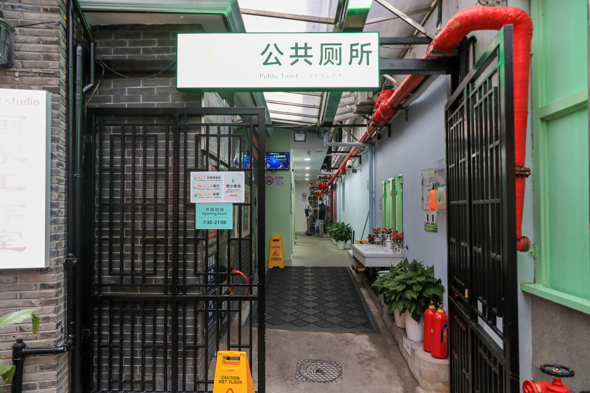 为了切实解决旅游高峰时游客“如厕难”,让田子坊景区的公共服务更贴心,去年,田子坊管理办花了不少心思——先对景区存量空间做了细致摸排,反复琢磨后敲定“三合一”改造方案,将泰康路210弄9号原本分散的空间进行功能性整合与置换,“挤”出了约60平方米的实用区域,打造出一座兼顾功能实用性与人文关怀的公厕。