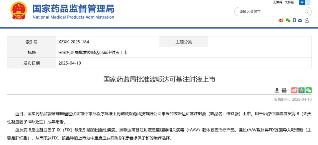 这是首个血友病B基因治疗药物,用于治疗中重度血友病B(先天性凝血因子IX缺乏症)成年患者。