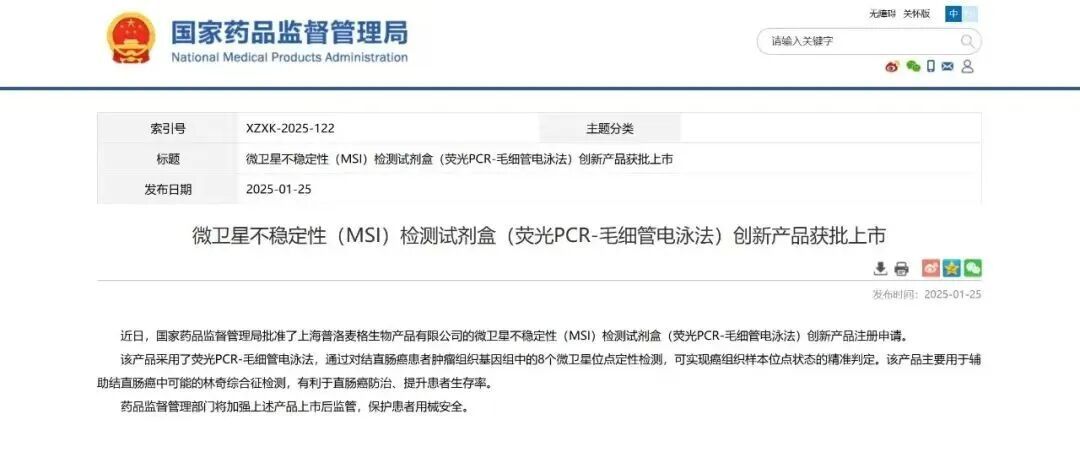 该产品采用了荧光PCR-毛细管电泳法,通过对结直肠癌患者肿瘤组织基因组中的8个微卫星位点定性检测,可实现癌组织样本位点状态的精准判定。该产品主要用于辅助结直肠癌中可能的林奇综合征检测,有利于直肠癌防治、提升患者生存率。