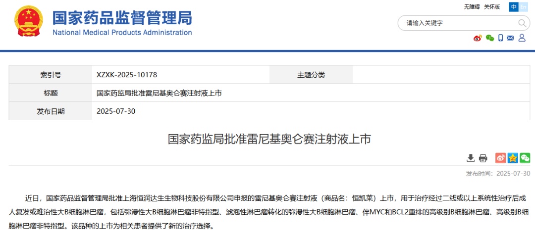 该药用于治疗经过二线或以上系统性治疗后成人复发或难治性大B细胞淋巴瘤,包括弥漫性大B细胞淋巴瘤非特指型、滤泡性淋巴瘤转化的弥漫性大B细胞淋巴瘤、伴MYC和BCL2重排的高级别B细胞淋巴瘤、高级别B细胞淋巴瘤非特指型。该品种的上市为相关患者提供了新的治疗选择。