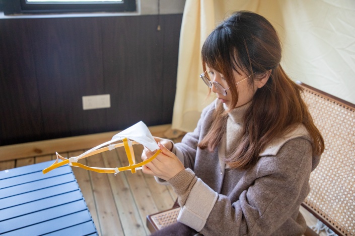骨架立稳后,便轮到素净的宣纸登场。根据鱼身各部位的大小,将宣纸裁剪成适配的纸片;先在竹篾骨架上贴好双面胶,再小心翼翼地将宣纸覆上,指尖轻轻抚平,让纸面尽量舒展平整,边缘处反复压实,避免日后翘边。
