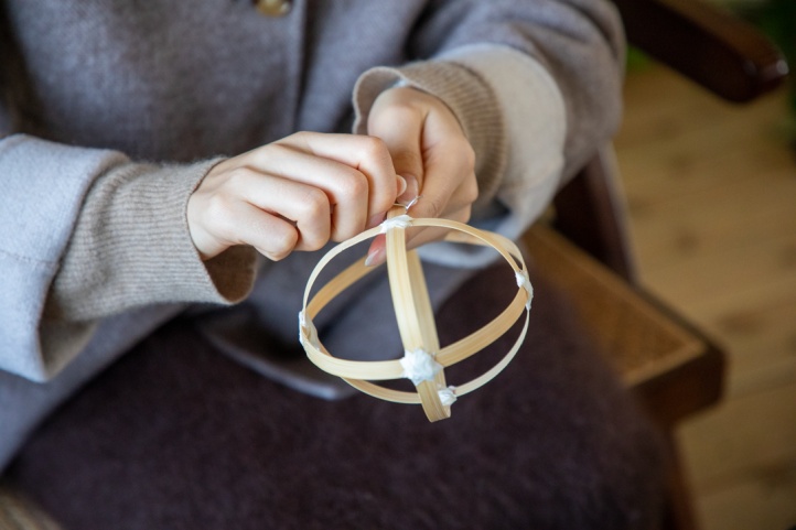 再剪两段短竹篾,分别做成鱼的侧身与鱼头骨架,随后用美纹纸将鱼头、鱼身与鱼尾细细衔接。缠绕时需贴合竹篾纹理,层层收紧,确保整个骨架稳固扎实,无一丝松动。