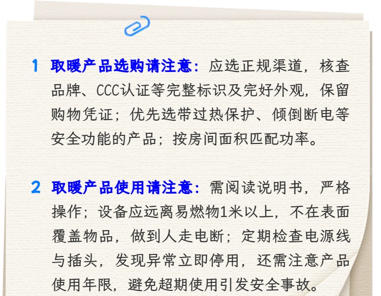 天气越来越冷,你是否在犹豫要不要买个取暖产品?市市场监管局在此提醒:购买取暖产品需谨慎! 选购和使用都有哪些注意事项,点击“划重点”极速浏览↓↓↓ 优先在信誉良好的商场、超市或官方授权的电商平台购买,避免购买“三无”产品。购买时应仔细检查产品是否有完整的标识,包括品牌、规格、生产厂家、CCC认证标志、合格证等。 购买时,检查产品外观是否完好,无划痕、变形、破损或裂缝。电源线应无破损、弯折,插头连接牢固。 购买时,建议优先选择具有过热保护、倾倒断电、防漏电等安全功能的产品,降低使用风险。 购买时,应根据房间面积和实际需求选择合适功率的取暖设备,避免超负荷用电。 购买后,要索要发票或购买凭证,作为消费维权的依据。若产品出现质量问题或安全隐患,可凭凭证向商家或相关部门投诉。 使用前,应仔细阅读产品说明书,了解正确的使用方法、注意事项和安全警示,严格按照说明书操作。 取暖设备应远离易燃物(如窗帘、沙发、床单等),保持至少1米的安全距离,不要在取暖设备表面覆盖物品,避免因热量积聚引发火灾。人走电断,长时间不用或外出时拔掉插头,防止意外通电。 使用过程中定期检查电源线、插头是否完好,如有破损及时更换。若发现设备温度异常、有异味或故障,立即停止使用并联系售后维修。 注意取暖产品的使用年限,如果使用年限过长,其安全性能会降低,容易引发安全事故。在取出设备使用时,要检查设备是否超过使用期限。 来源:市市场监管局 编辑:陆海华 责编:李琳、陆海华