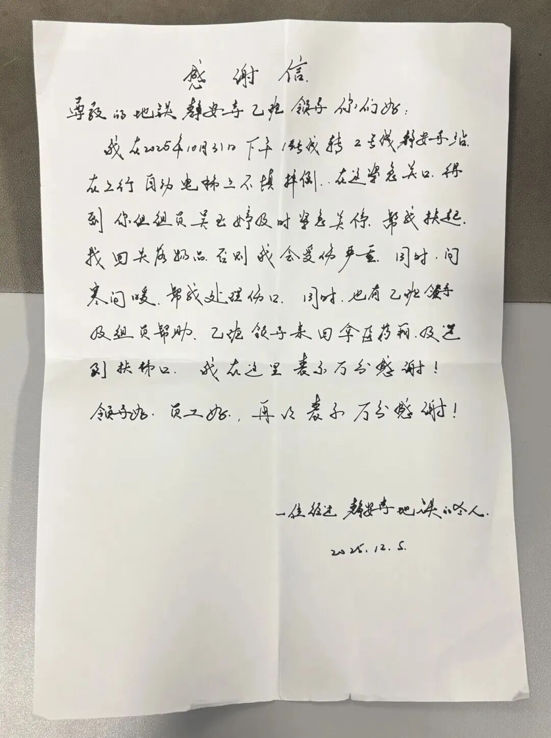 近日,上海地铁静安寺站接连收到乘客的感谢信与锦旗,两次突发状况下,车站工作人员凭借快速反应、专业处置与贴心关怀,为乘客筑起安全防线,让冬日里的地铁出行满溢温情。 2025年10月31日下午,一名乘客在换乘时不慎摔倒在自动扶梯上。多职能巡视队员吴玉婷第一时间关停扶梯,与多职能队员王静涛共同扶起乘客、找回散落物品。多职能队长周夏辉取来医药箱,护送乘客至安全区域,细致处理伤口并嘘寒问暖。乘客手写感谢信,以“万分感谢”肯定工作人员的贴心服务。 2025年12月13日晚,2号线车厢内一名乘客突发癫痫晕倒昏迷。站务员包亦杰立即按下紧急停车按钮,与热心乘客协作,将乘客抬至站台并以屏风保护隐私,值班站长夏彦若及时采取措施,该名乘客逐渐恢复了意识,多职能队长孙瑜与民警联系上其家属,站务员方菁陪同乘客搭乘120前往医院,直至家属赶到才返程。家属葛女士专程送上锦旗,致谢这份“救命恩情”。