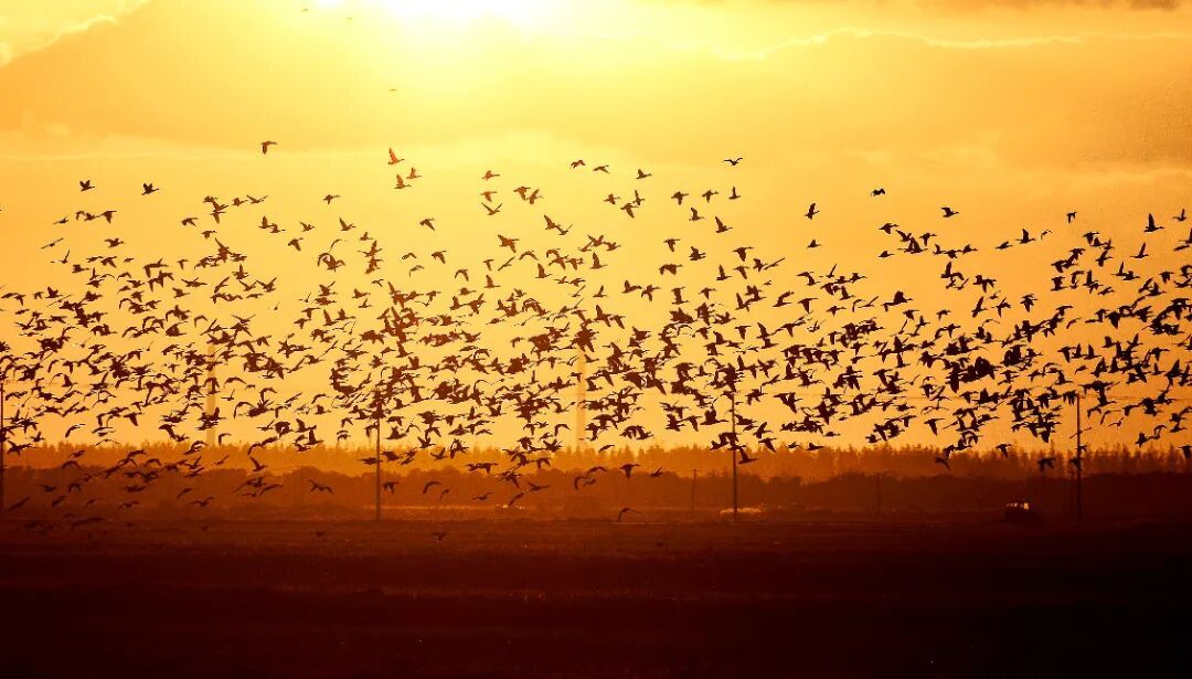 东滩落日鸟群剪影