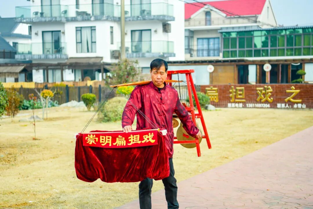 “先卸担,然后插杆、挂布幔、系紧绳索,舞台就这样搭好了。”上海市非物质文化遗产崇明扁担戏第三代传承人朱雪山一边解说,一边熟练地演示着搭台全过程。