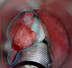 为了在彻底切除肿瘤的同时最大可能地保留喉功能,徐赫医生决定实施“显微镜辅助下经直达喉镜喉恶性肿瘤扩大切除术”。显微镜的使用提高了手术难度,但也让肿瘤显露更加清晰。在显微镜的精准鉴别下,肿瘤的实际范围比术前预估的更为广泛。术中取材证实,肿瘤不仅侵犯左侧声带及室带,还累及声带前联合、室带前联合,并牵连至右侧声带及室带前端。即便是微创手术视野,暴露肿瘤的全貌仍存在困难。
