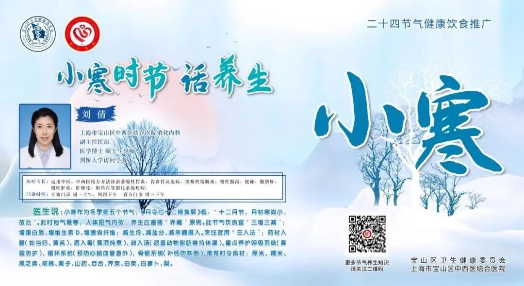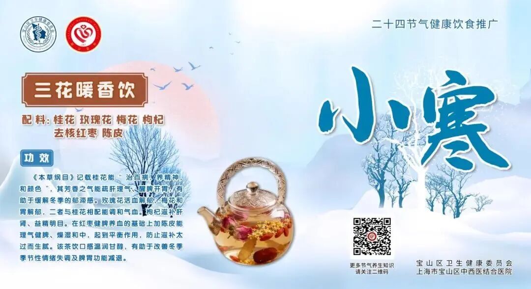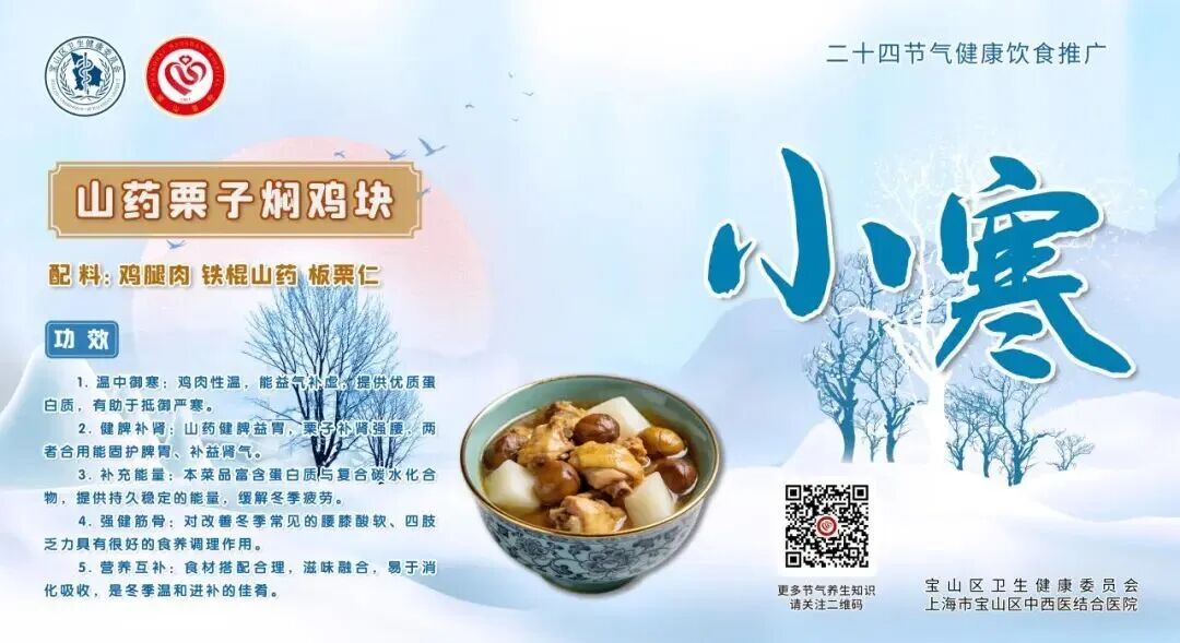 为积极践行国家卫健委“二十四节气养生与健康”理念,深度响应宝山区卫健委“健康四季——二十四节气话健康”特色科普品牌,宝山区中西医结合医院依托中西医结合专业优势,组织资深医师与营养师团队,将节气养生智慧与现代营养学深度融合,重磅推出二十四节气系列健康养生膳食。 本次聚焦小寒时节,特别推出以“养阴蓄阳・固本强身”为主题的膳食组合,精选时令食材打造菜肴、茶饮、糕点等养生组合,助您以食为养、顺时而补,顺应此时寒邪偏盛、阳气深潜的节气特点,在寒气渐盛,阳气回升之际,尽享冬日科学养生之益。
