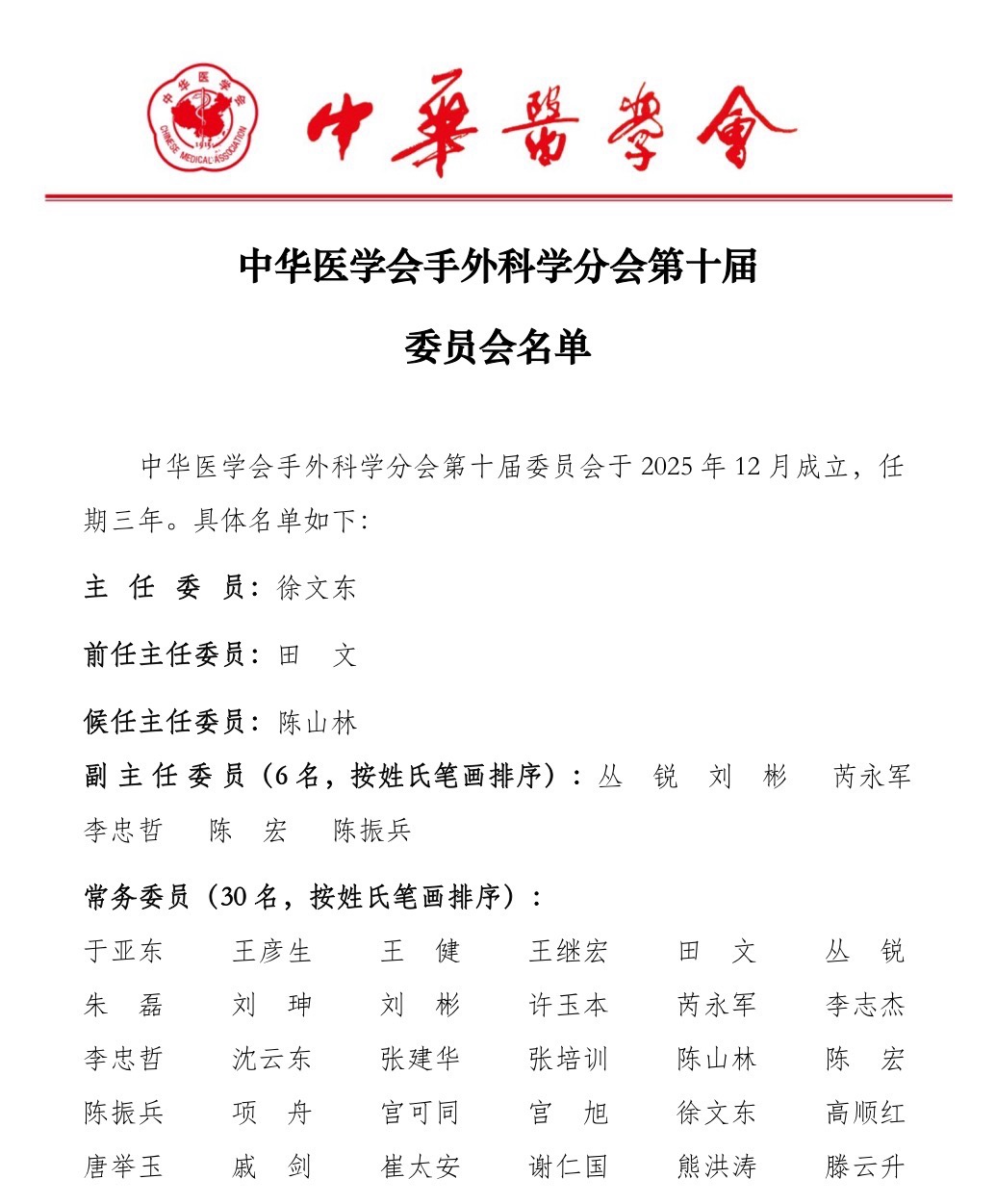 2025年12月,中华医学会手外科学分会召开换届选举会议,复旦大学附属华山医院徐文东教授再次当选中华医学会手外科学分会第十届委员会主任委员,沈云东教授当选常委。