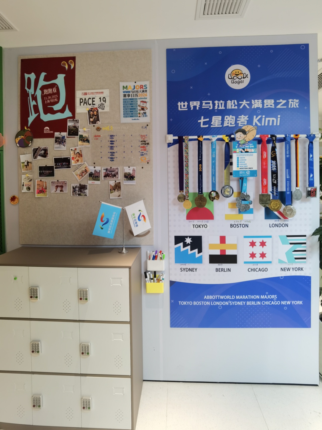 走进“跑者驿站”,跑步主题元素随处可见:满墙的马拉松奖牌和号码簿、国内外跑者的留言和照片……为更精准地保障跑团这一青年自组织所需要的基础设施,驿站还配备了跑鞋架、储物柜、洗澡间等共享功能。