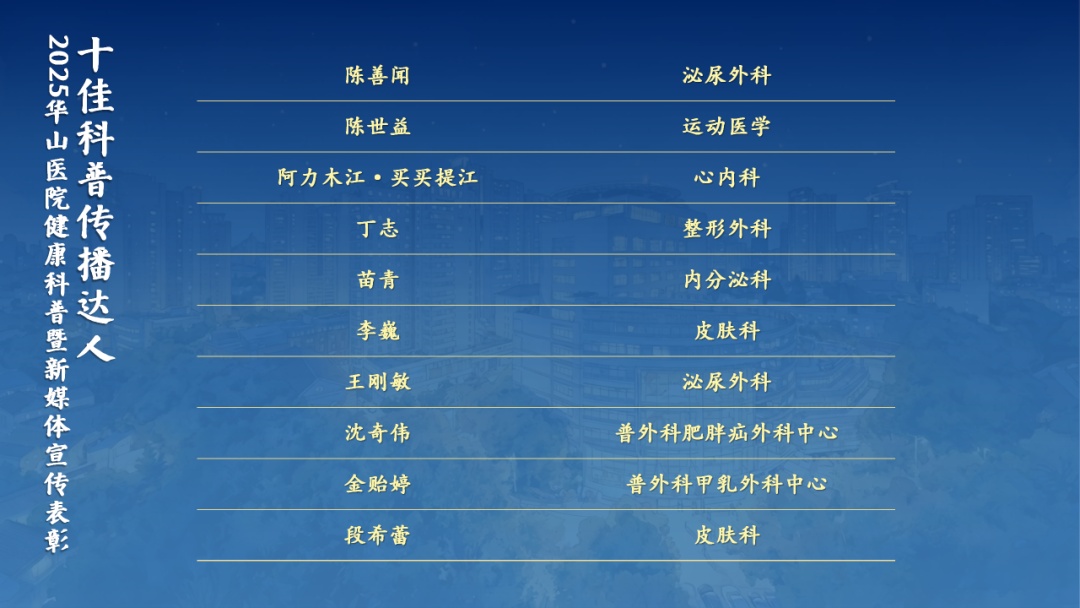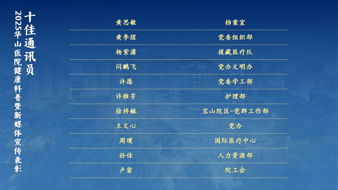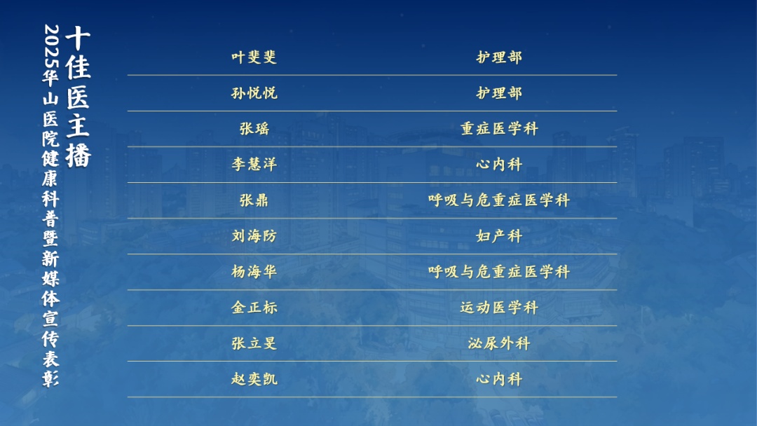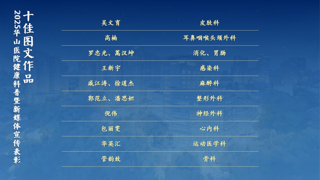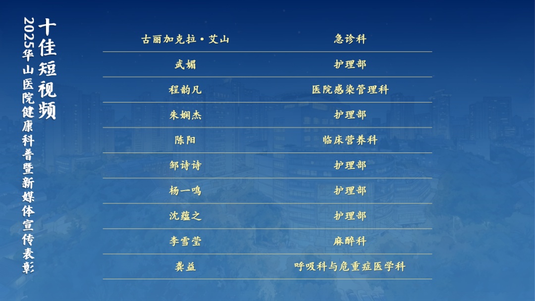 华山科普人才辈出,医院专门设立了青年科普人才奖励专项,也开展了青年科普大赛。伍蓉副院长宣读2025华山医院院内健康科普立项名单和第七届华山医院青年医学科普能力大赛获奖名单。
