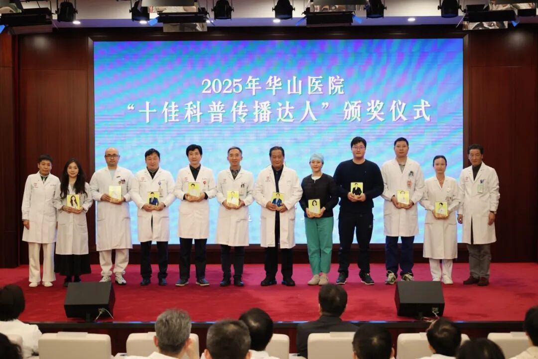 2025年华山科普取得的丰硕成果,来自于各科室、个人的新媒体平台百花齐放,来自于每一位华山人积极创新、投入创作而呈现的大批优质科普作品。大会表彰了2025华山医院健康科普暨新媒体宣传评选“十佳微信公众号”“十佳科普传播达人”“十佳图文作品”“十佳短视频”“十佳医主播”“医直播优秀组织奖”“十佳通讯员”。与会院领导为各获奖集体和个人颁奖。