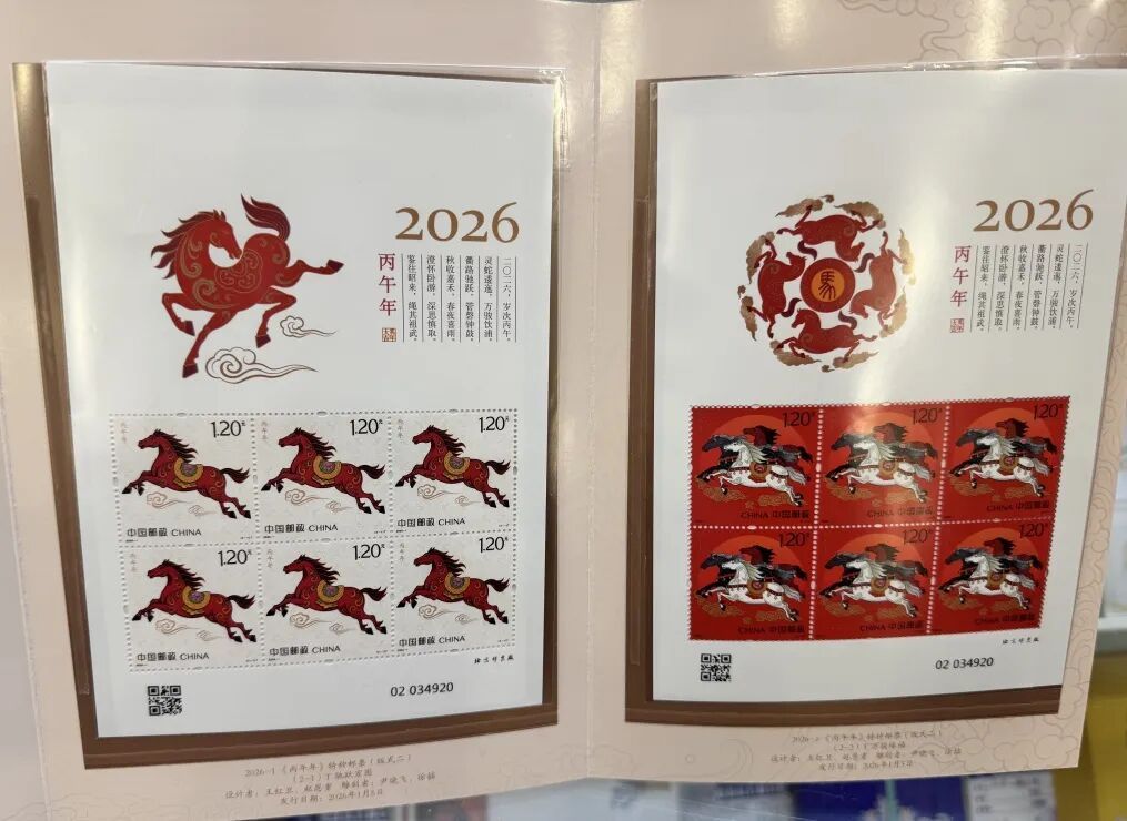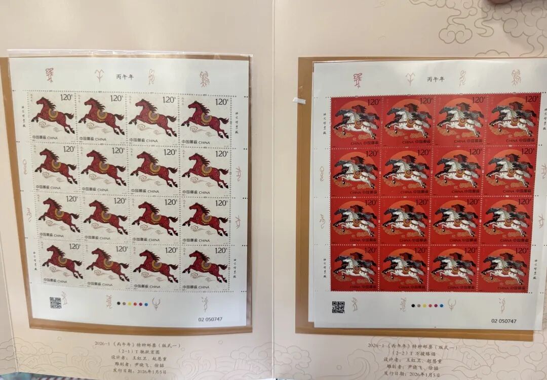 《丙午年》特种邮票一套两枚。第一枚图名为“驰跃宏图”,以“腾跃新时代”为核心意象,展现了一匹红马奔驰于祥云之上,鬃毛如焰,四蹄生风。第二枚图名为“万骏臻福”,以“万马奔腾,驰骋千里”为核心意象,展现了三匹奔跑的骏马。三为众,寓意奔腾不息、共同奋进。孙茂兴是资深邮迷了,今年他特意带着自己攒了10年的邮品带到现场,买到新邮立马张贴。