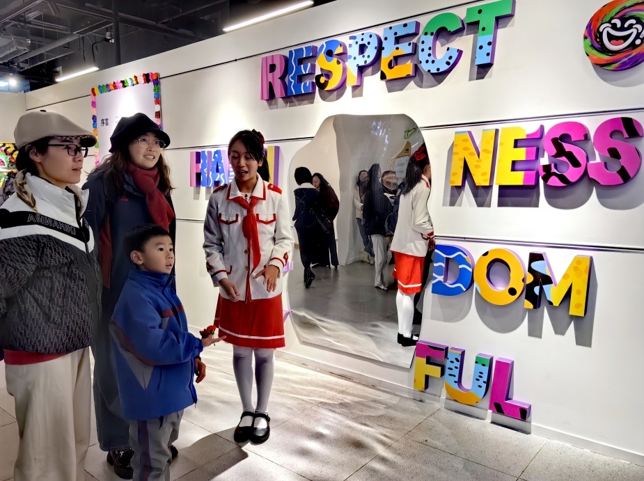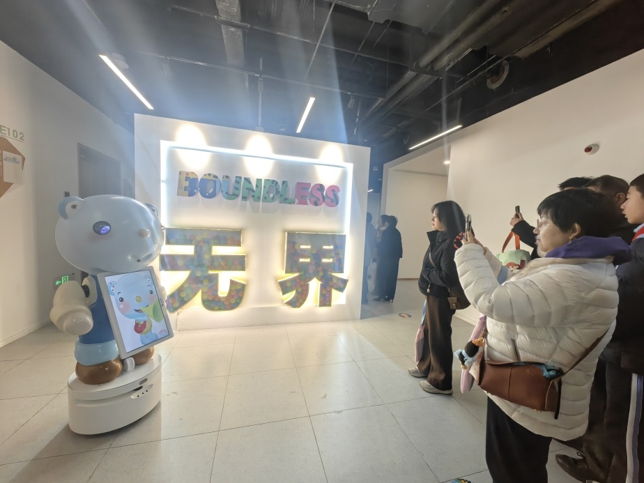 “剪刀成了他们的笔,色彩成了他们的声音。” 展览现场,浦东新区辅读学校的吉祥物机器人海贝热情招呼观众。本次展览以“无界”为核心,精心划分“无界・融美”“无界・融合”“无界・融心”三大展区,159件作品错落陈列,它们由80余名多名特殊学生在10位美术教师的悉心指导下完成。每一笔色彩、每一道纹路,都是特殊儿童内心世界的独特投射。在14名红理会少先队员的细致导览下,观众在一面面各具特色的艺术墙前驻足,倾听每一幅作品背后的成长故事。